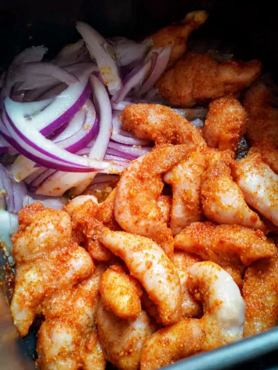 Tout commence avec des aiguillettes de poulet bien tendres. Coupe finement une petite oignon rouge en demi-rondelles. Dans un bol, mélange tes morceaux de poulet avec du paprika doux, une pincée de sel et du poivre. Ce trio donne une couleur dorée et une odeur irrésistible dès la première minute de cuisson.