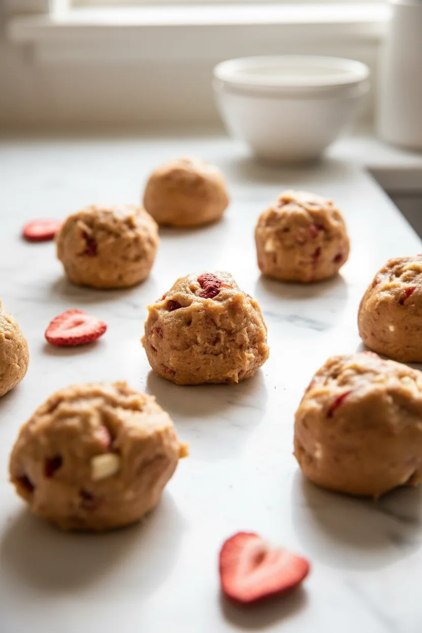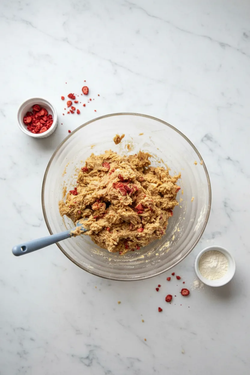 Évitez de trop travailler la pâte pour ne pas développer le gluten de la farine, ce qui rendrait les biscuits durs. Ensuite, ajoutez délicatement les pépites de chocolat blanc et les fraises lyophilisées. Pour finir, versez la confiture de fraises et tournez-la très légèrement dans la pâte pour créer de jolis marbrures roses. Ne mélangez pas complètement.