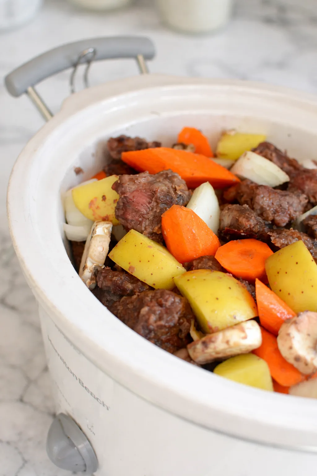- Ajoutez les pommes de terre, champignons (facultatif), carottes et oignon dans la mijoteuse.