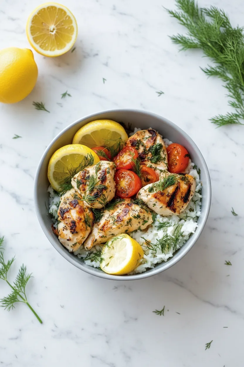 Ces bols de poulet méditerranéen au citron et à l’aneth sont la définition d’un repas équilibré et savoureux. Ils sont simples à réaliser, utilisent des ingrédients sains et plairont à toute la famille. La sauce crémeuse à l’aneth, l’acidité du citron et la douceur des tomates rôties créent une harmonie de saveurs irrésistible.