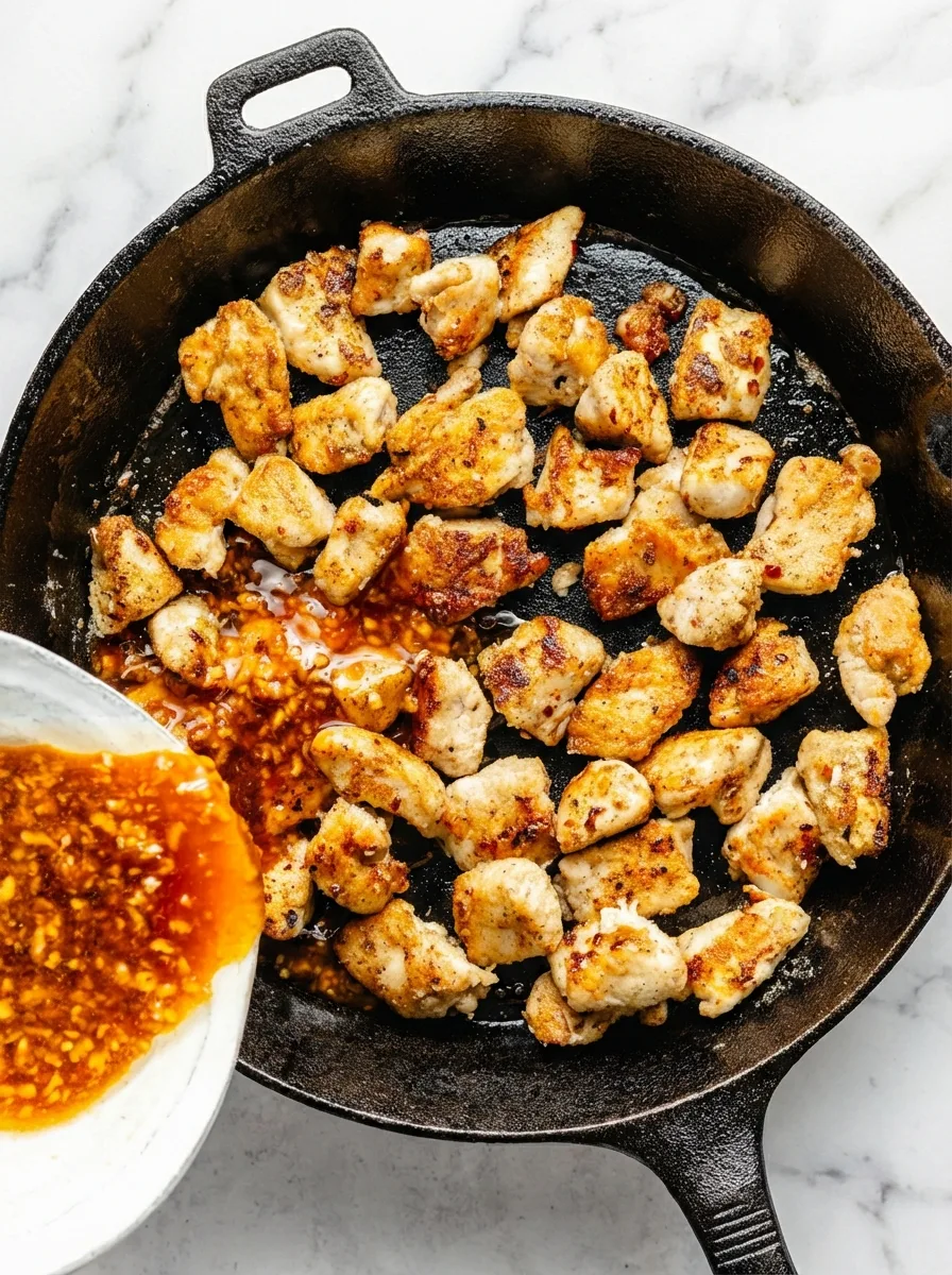 Revenez le poulet dans la poêle avec la sauce pendant 4 à 5 minutes supplémentaires. Remuez régulièrement pour que chaque morceau soit généreusement nappé. Le temps de cuisson déterminera la texture finale : plus court pour une sauce fluide réduite de moitié, plus long pour une consistance épaisse et caramélisée.