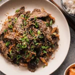 - Servir : Dispose le Bulgogi sur un plat, garnis d’oignons verts et de graines de sésame. Accompagne de riz chaud.