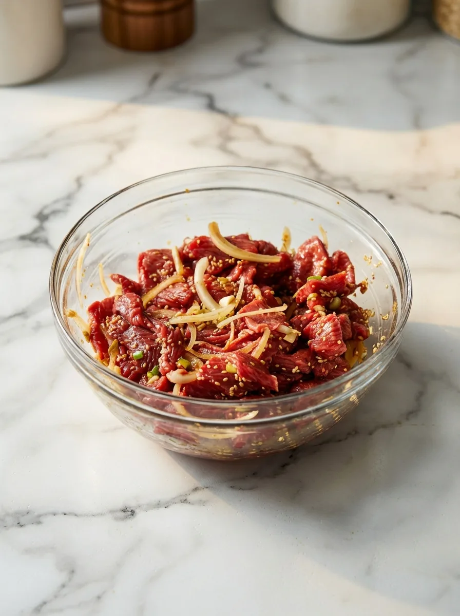 Déposez vos lamelles de bœuf dans le saladier et mélangez délicatement pour que chaque morceau soit bien enrobé. Ensuite, couvrez d’un film alimentaire et placez au réfrigérateur pendant 1 heure minimum. Pour une saveur encore plus intense, prolongez la marinade jusqu’à 24 heures.