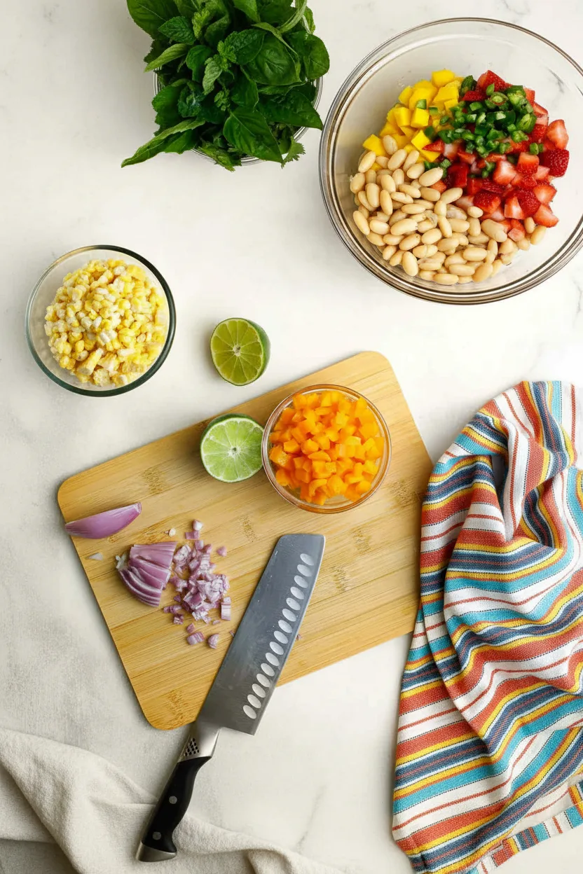 Commencez par laver soigneusement tous les produits frais. Épluchez la mangue et coupez la chair en petits dés. Lavez et équeutez les fraises, puis coupez-les également en dés. Coupez le demi-poivron rouge en petits morceaux. Prélevez les grains des deux épis de maïs en utilisant un couteau bien aiguisé.