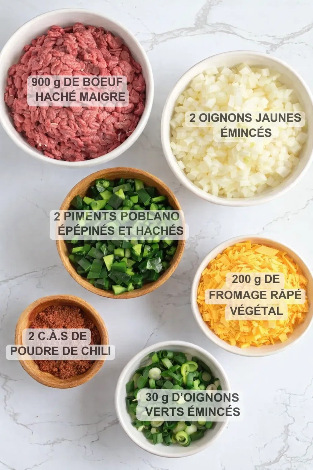 - 900 g de bœuf haché maigre (option : volaille hachée ou porc haché)