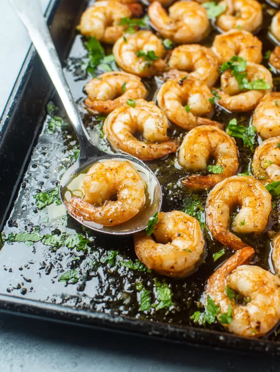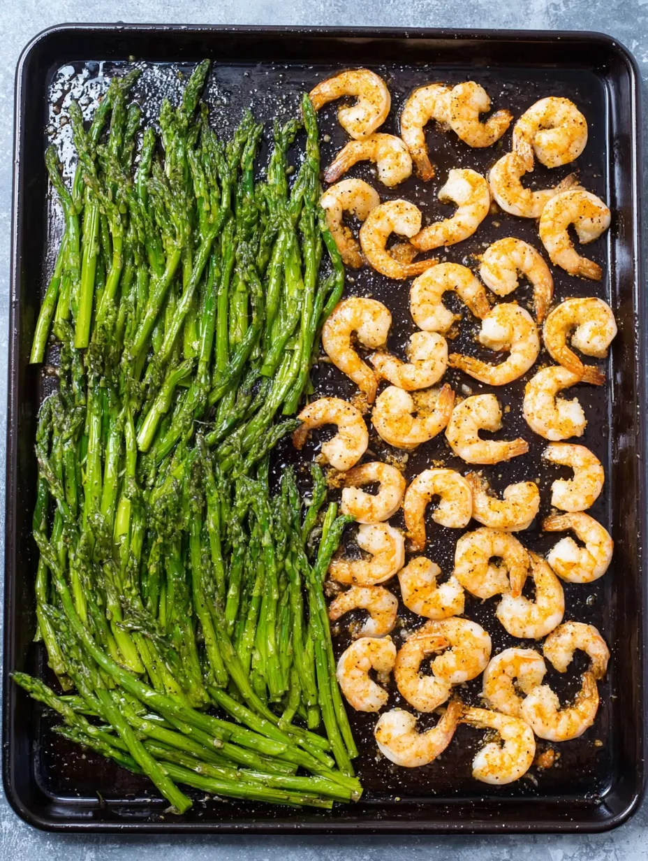 La seconde étape est tout aussi simple : après ces quelques minutes de cuisson, déplace les asperges d’un côté de la plaque et ajoute les crevettes sur l’autre moitié. Un peu d’huile d’olive, une pincée de sel, un soupçon de piment doux pour relever le goût, et on remet le tout au four pour environ 7 minutes supplémentaires.