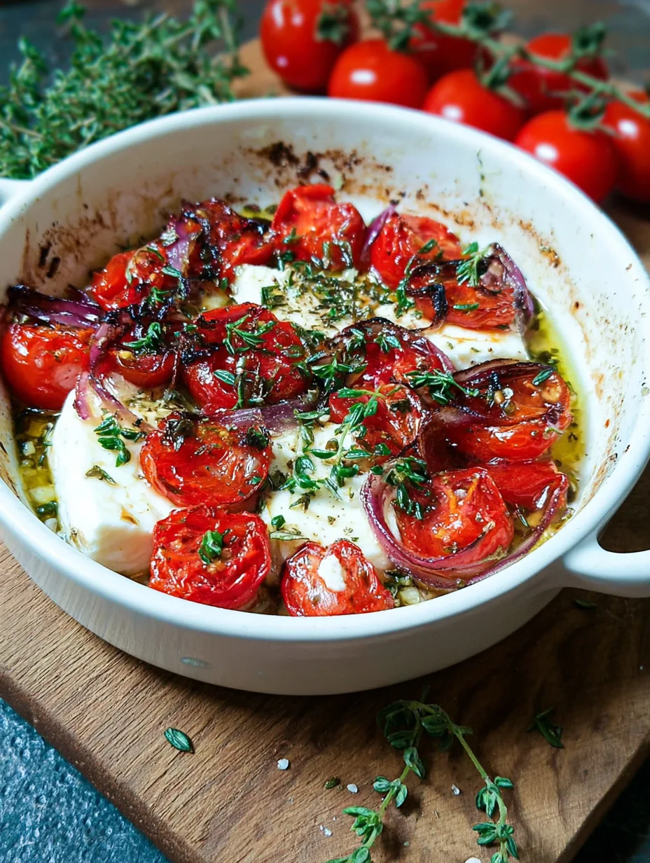 À la sortie, le fromage a pris une belle teinte dorée, les oignons sont tendres, et l’huile s’est parfumée d’herbes et de jus de tomates. Verse tout dans une assiette creuse et déguste aussitôt avec une tranche de pain grillé ou quelques feuilles de roquette.