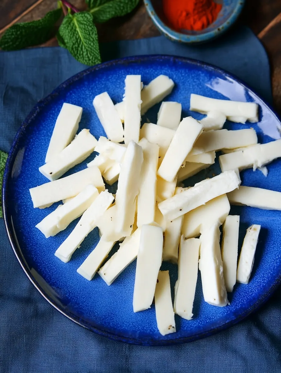 Tout commence par une bonne découpe. Coupe le halloumi en bâtonnets réguliers, ni trop fins ni trop épais, pour qu’ils cuisent uniformément.