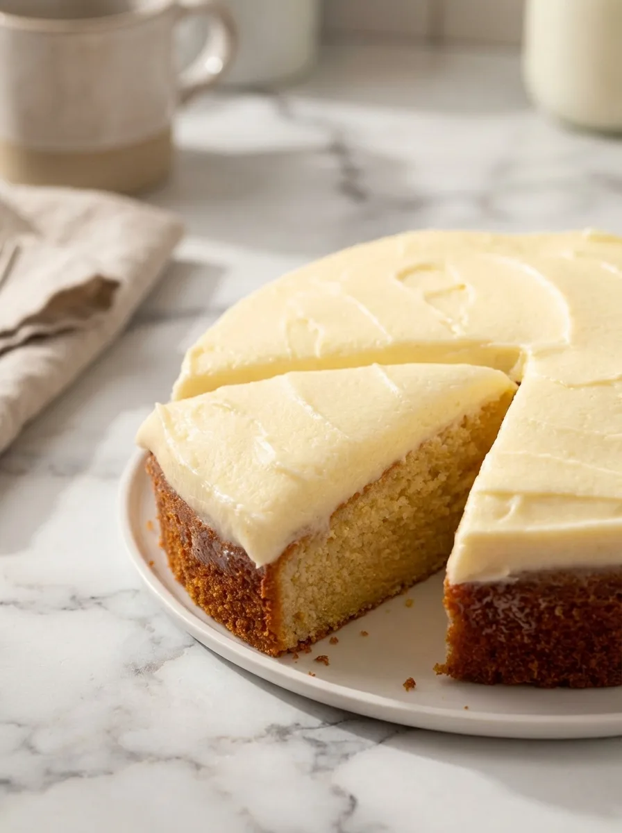 Gâteau moelleux et rapide avec un glaçage crémeux à la crème fraîche, parfait pour les desserts improvisés