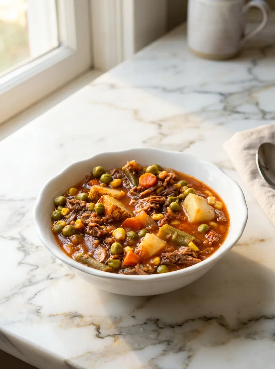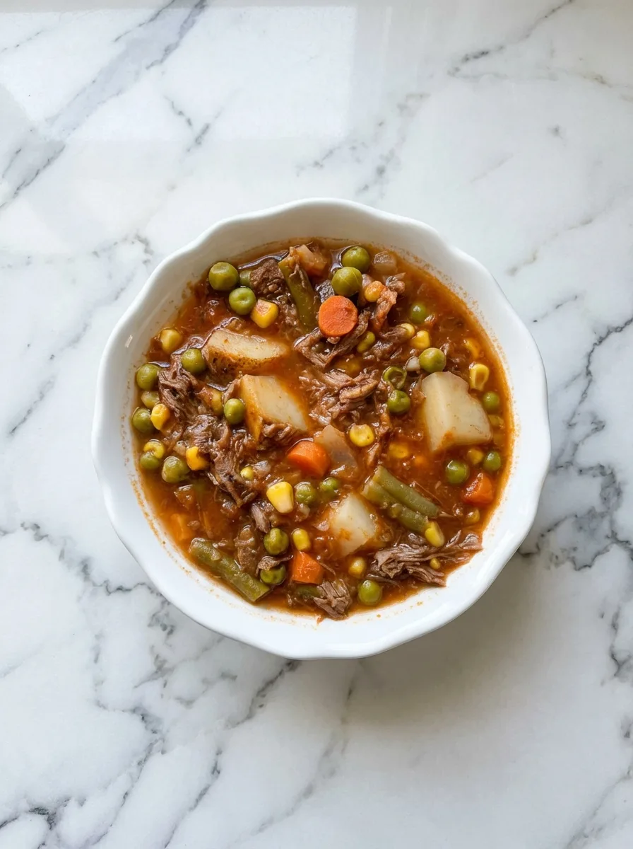 Une soupe reconfortante et familiale avec du boeuf effiloche tendre, des legumes et une base savoureuse de tomate, mijotee lentement pour des saveurs profondes.