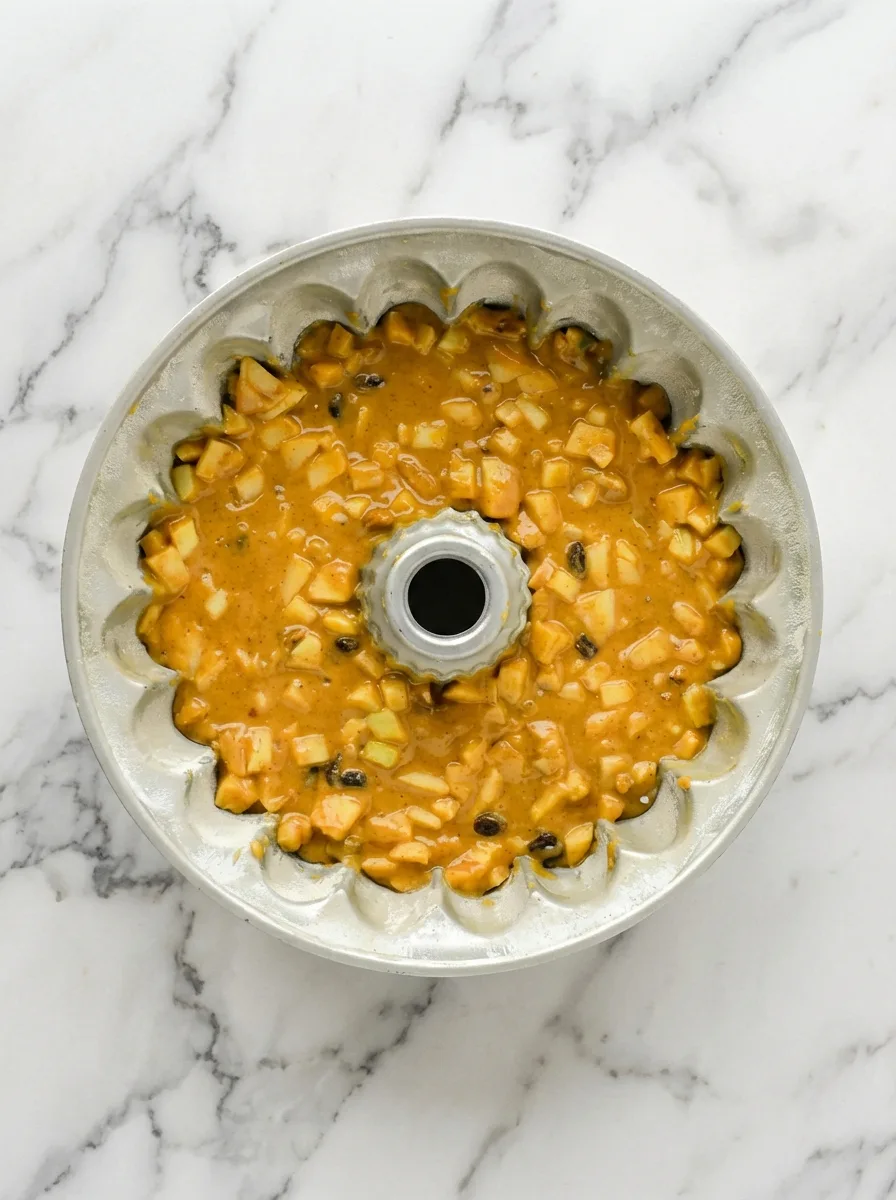 Ajoutez enfin les dés de pommes, les noix et les raisins secs. Mélangez avec précaution pour bien répartir les ingrédients sans écraser les fruits. Versez la préparation dans le moule préparé en lissant la surface avec le dos d’une cuillère.