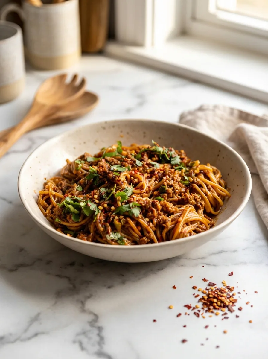 Nouilles coréennes épicées au gochujang avec viande hachée, prêtes en 30 minutes pour un dîner savoureux.
