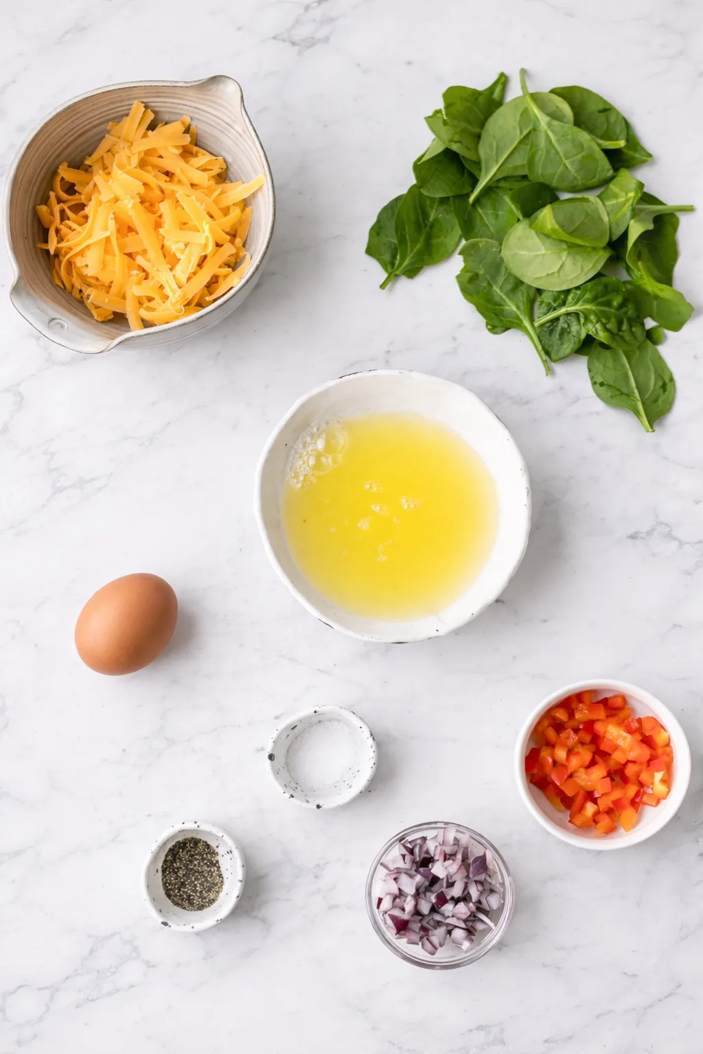 - Dans un petit bol, battez légèrement l’œuf et les blancs d’œufs à la fourchette. Ajoutez les légumes et assaisonnez de sel et poivre. Mélangez bien.