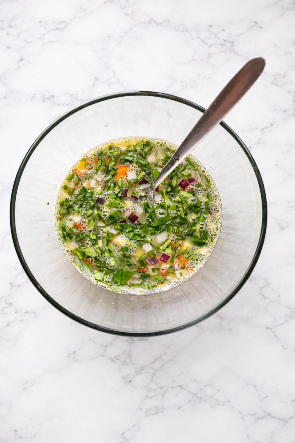 Dans un petit bol, battez légèrement l’œuf entier avec les blancs d’œufs à la fourchette jusqu’à obtenir un mélange homogène. Incorporez tous les légumes hachés puis assaisonnez avec le sel et le poivre. Mélangez énergiquement pour bien répartir les ingrédients.