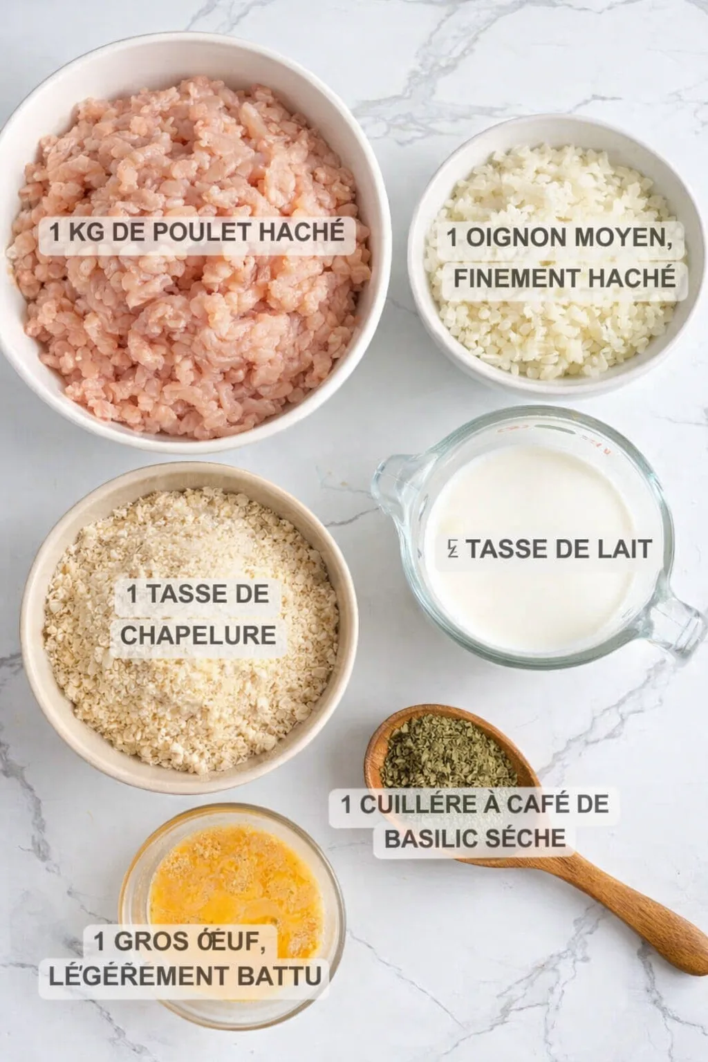 - 1 kg de poulet haché (préférez du blanc de poulet pour une version plus maigre)