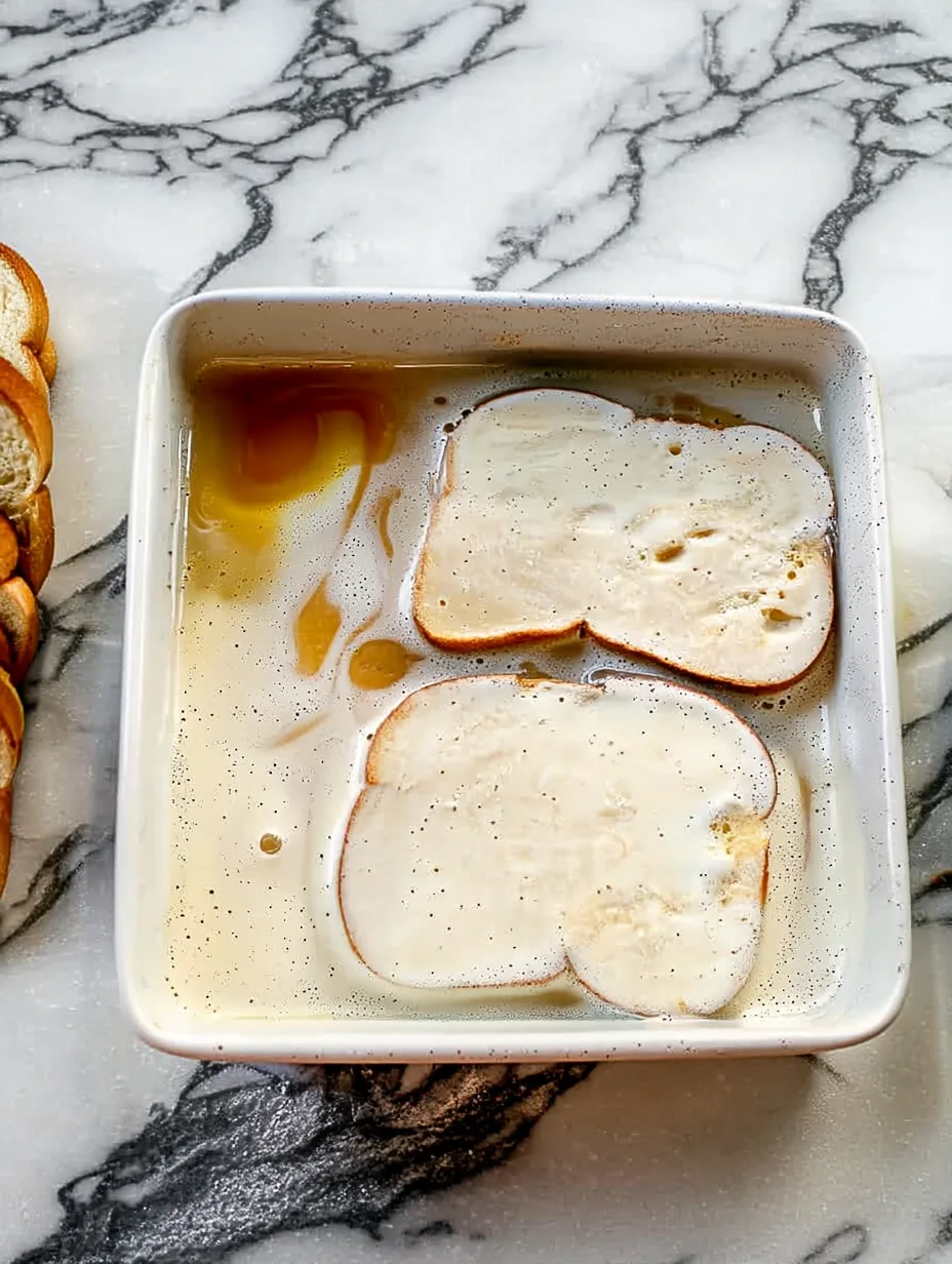 Plonge les tranches de pain dans la préparation. Laisse-les s’imbiber quelques secondes de chaque côté pour qu’elles soient bien moelleuses sans se casser.