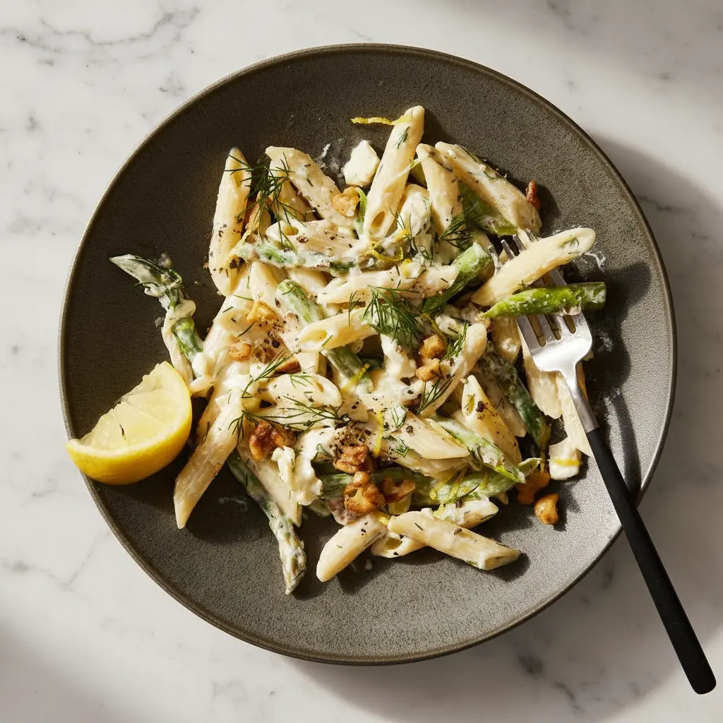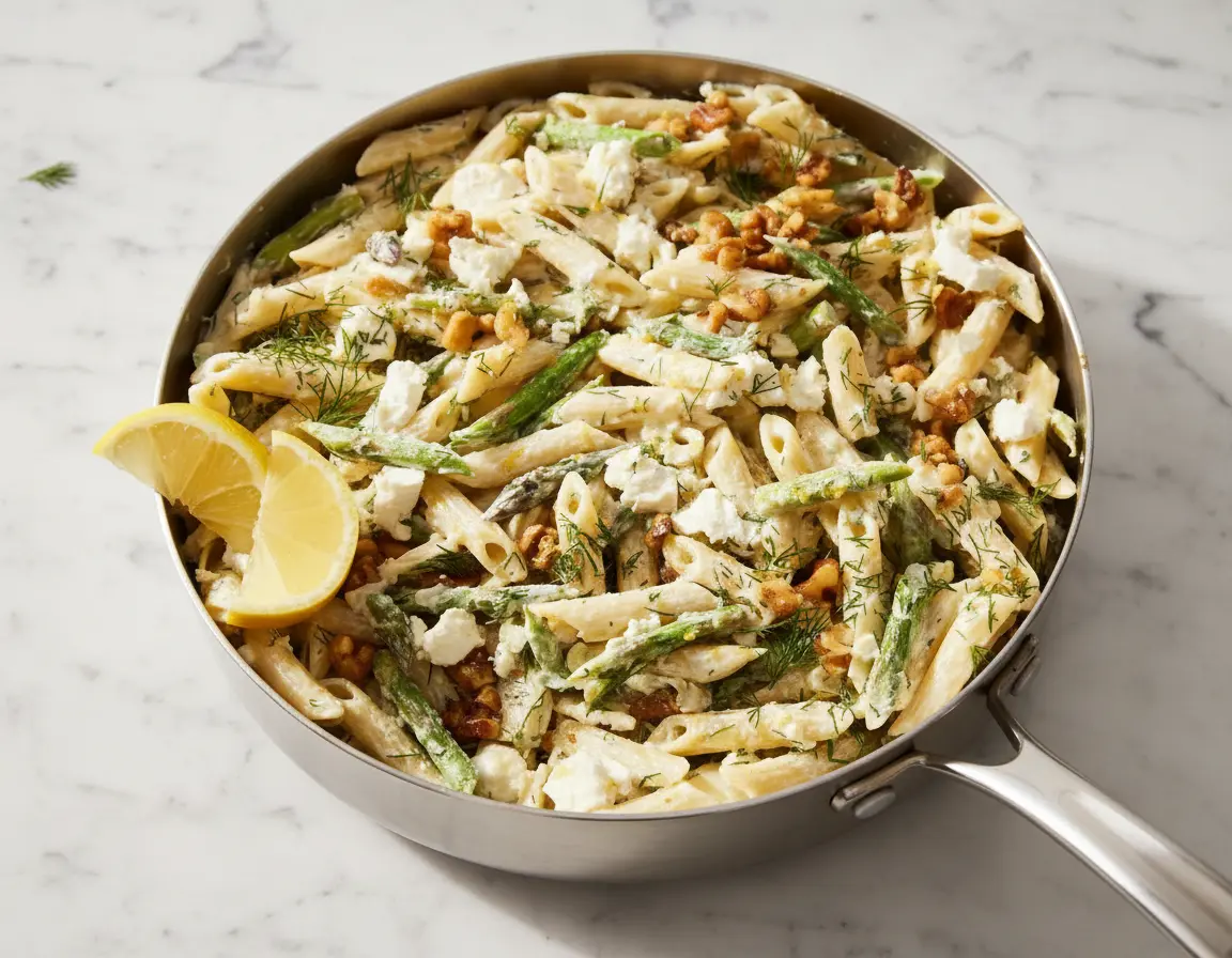 Pâtes penne onctueuses dans une sauce au yaourt grec et à la feta, relevée de citron et accompagnée d’asperges croquantes et de noix grillées. Un plat printanier rapide et plein de fraîcheur.