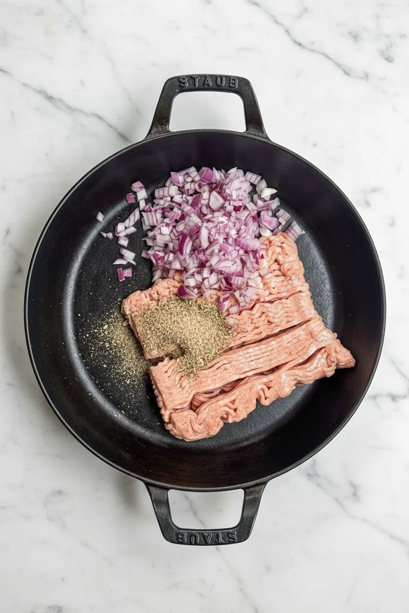 Commencez par preparer votre poulet. Prechauffez une grande poele a feu moyen-vif. Ajoutez le poulet hache et l’oignon rouge hache. Utilisez une cuillere en bois pour casser le poulet et le faire cuire uniformement. Faites cuire pendant environ 5 a 7 minutes, jusqu’a ce que le poulet ne soit plus rose.