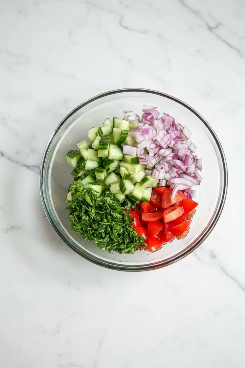 Deuxiemement, ne negligez pas le temps de marinade pour la salade de legumes. Meme 10 minutes permettent aux saveurs de la vinaigrette de penetrer les tomates et le concombre.