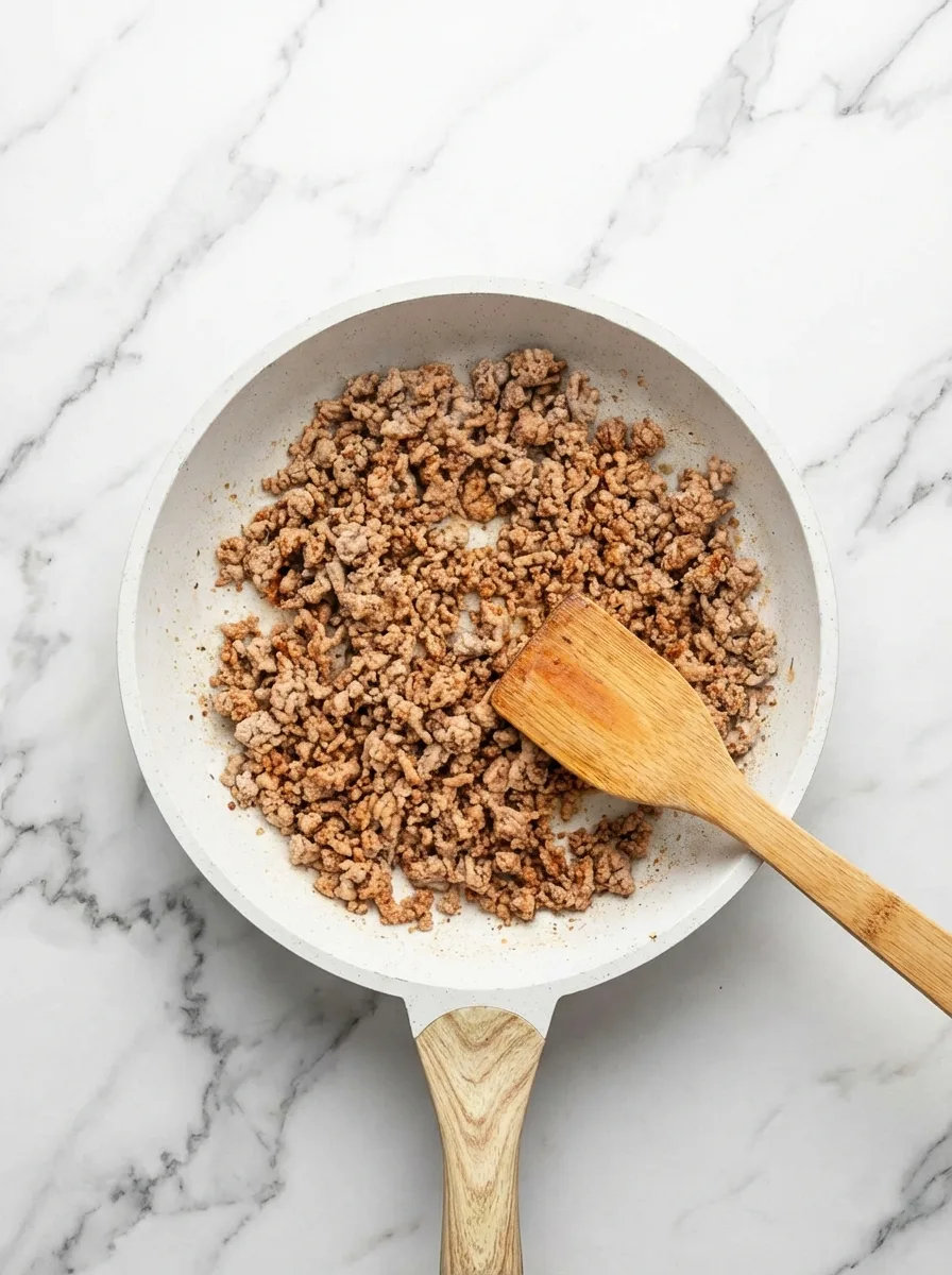 - Faites dorer la viande hachée dans une grande poêle à feu moyen-vif en l’émiettant à la spatule.