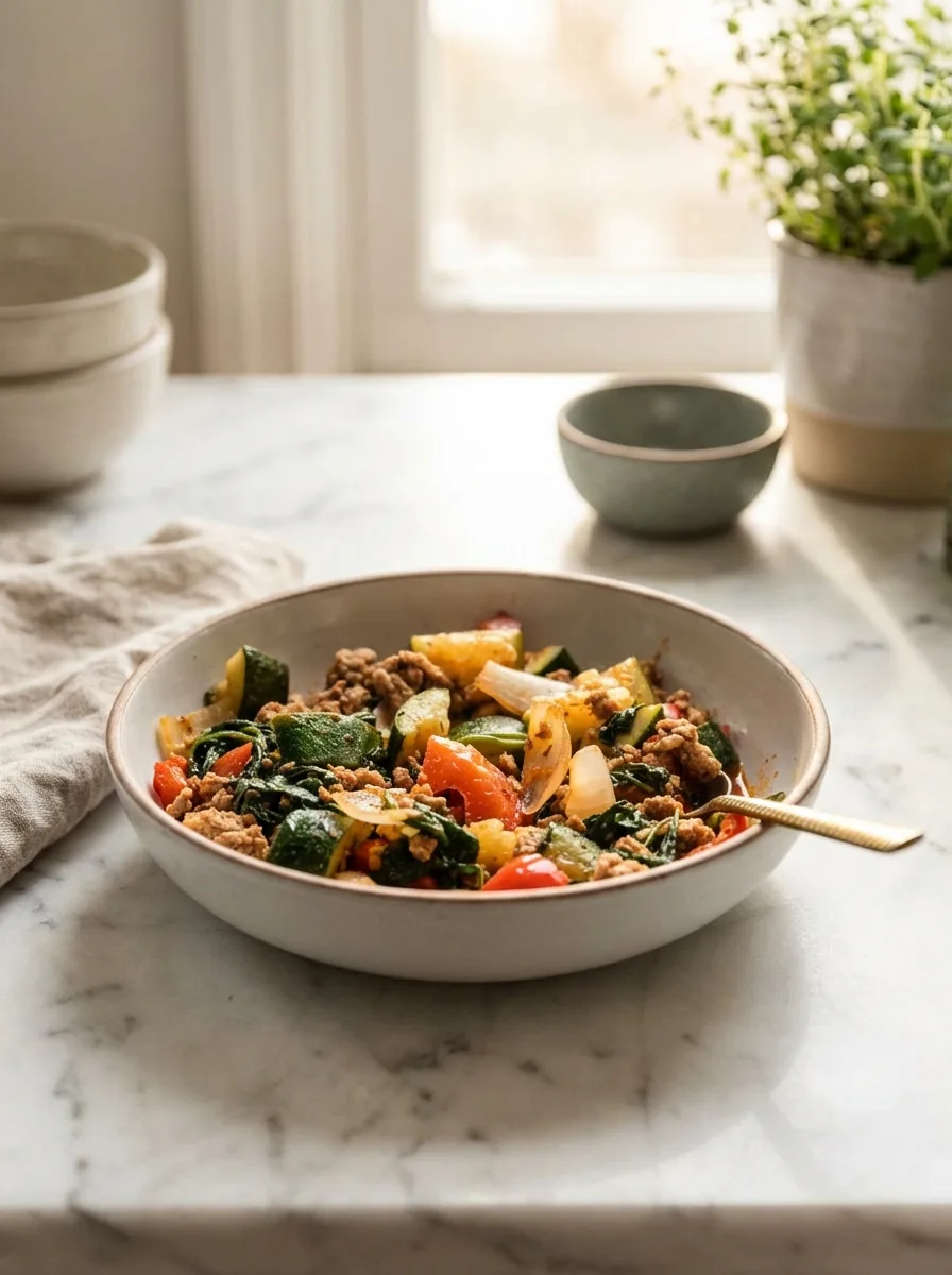 Une poêlée rapide et équilibrée combinant dinde hachée, courgettes croquantes et épinards frais, parfaite pour un dîner santé prêt en 30 minutes.
