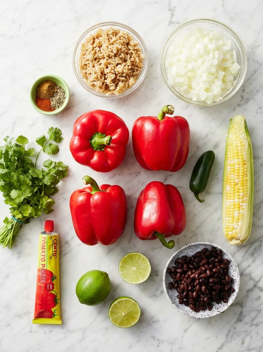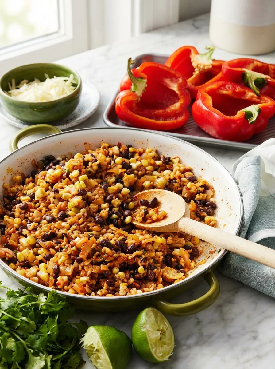 Poivrons colorés farcis d’une délicieuse préparation au riz et légumes, un plat végétarien complet et savoureux