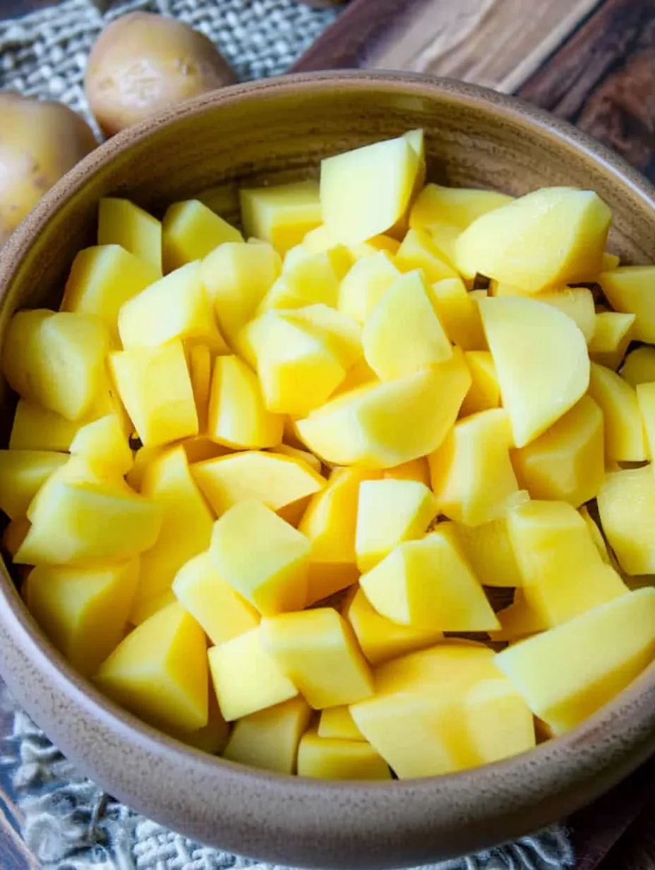 - Épluche et coupe les pommes de terre en morceaux réguliers.
