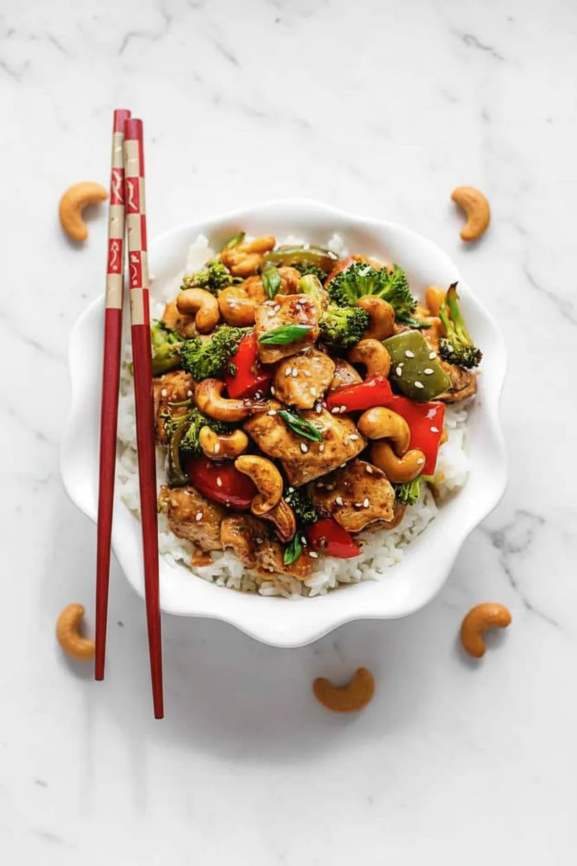 Ces valeurs sont approximatives et peuvent varier en fonction des marques d’ingrédients utilisées et des tailles de portion. Le plat est une bonne source de protéines maigres grâce au poulet. Les noix de cajou apportent des graisses insaturées bénéfiques. Les légumes contribuent aux fibres et aux vitamines. Pour réduire le sodium, vous pouvez utiliser de la sauce soja à teneur réduite en sodium comme indiqué, ou même la diluer légèrement avec de l’eau.