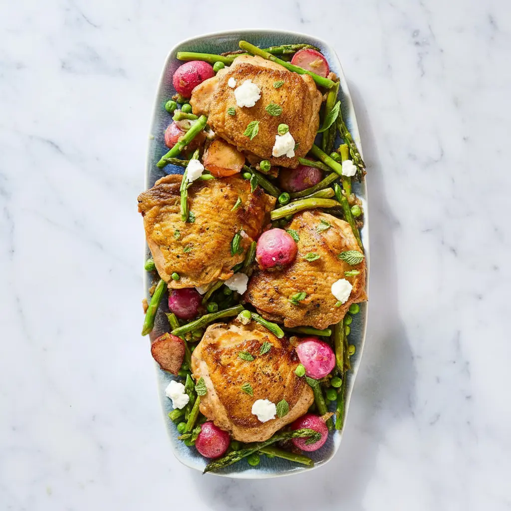 Un plat printanier alliant des cuisses de poulet à la peau croustillante et des légumes de saison rôtis (radis, asperges, petits pois), le tout relevé de fromage de chèvre et d’herbes fraîches. Une cuisson mixte poêle/four pour un résultat parfait.