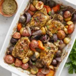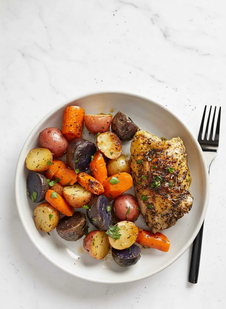 Un plat réconfortant avec du poulet doré et des légumes d’hiver caramélisés