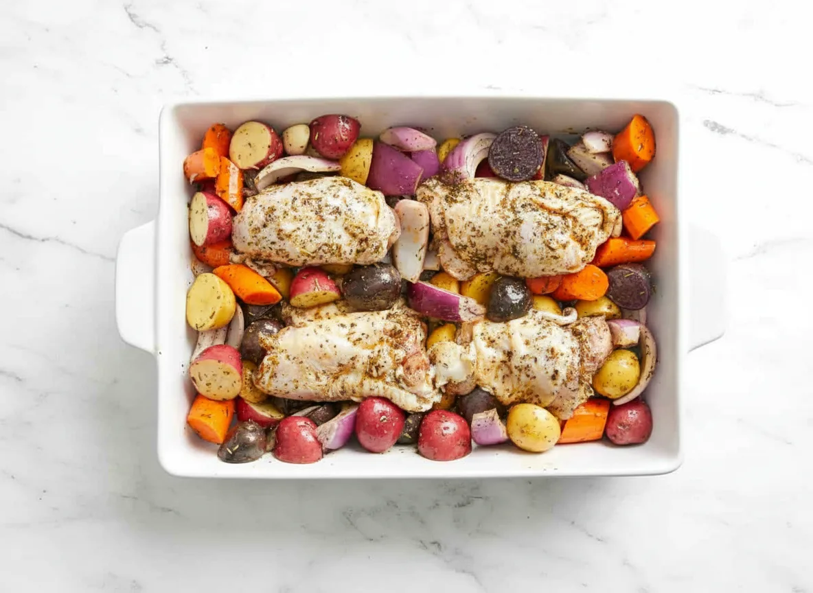 Versez les légumes dans un grand saladier et arrosez-les avec la moitié de la marinade. Mélangez bien jusqu’à ce que tous les morceaux soient uniformément enrobés. Transférez ensuite dans un plat à gratin de 25×35 cm ou plus grand. Placez les cuisses de poulet dans le même saladier et versez le reste de marinade dessus. Tournez délicatement pour bien les couvrir d’aromates.