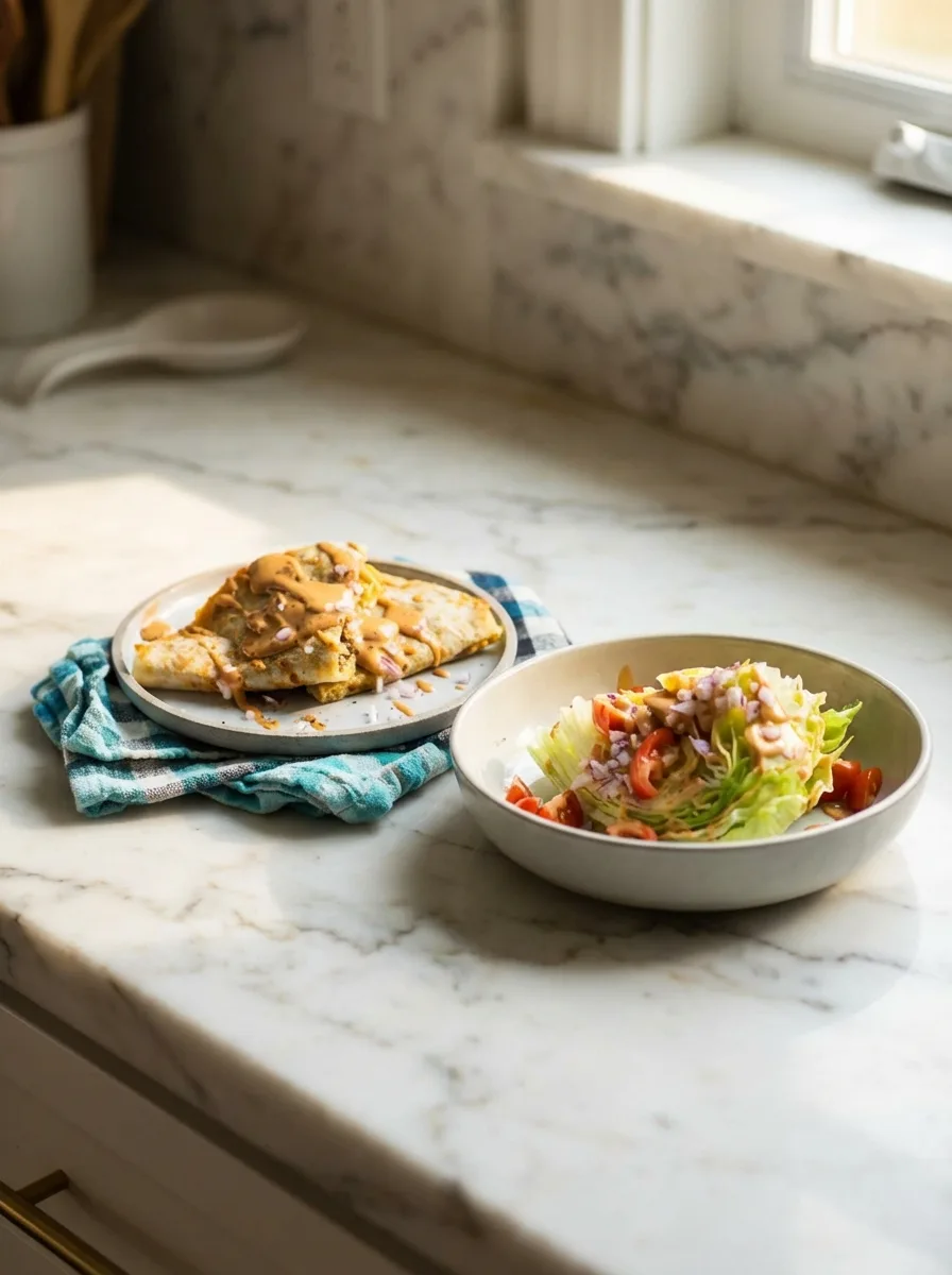 Contrairement à une simple quesadilla, cette version apporte protéines, légumes croquants et sauce maison. Le duo plat principal + salade wedge simplifie le service sans compromis sur l’équilibre nutritionnel.