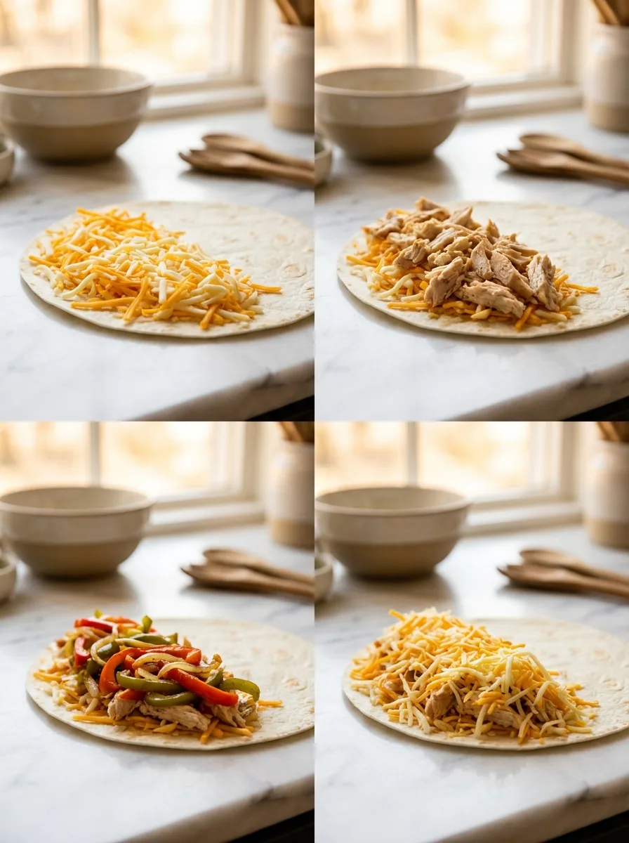 Étalez le fromage sur la moitié de chaque tortilla. Répartissez uniformément le poulet et les légumes. Recouvrez d’une seconde couche de fromage avant de replier la tortilla. Cuisez chaque quesadilla 3 minutes par face dans une poêle chaude jusqu’à obtenir un extérieur croustillant et doré.