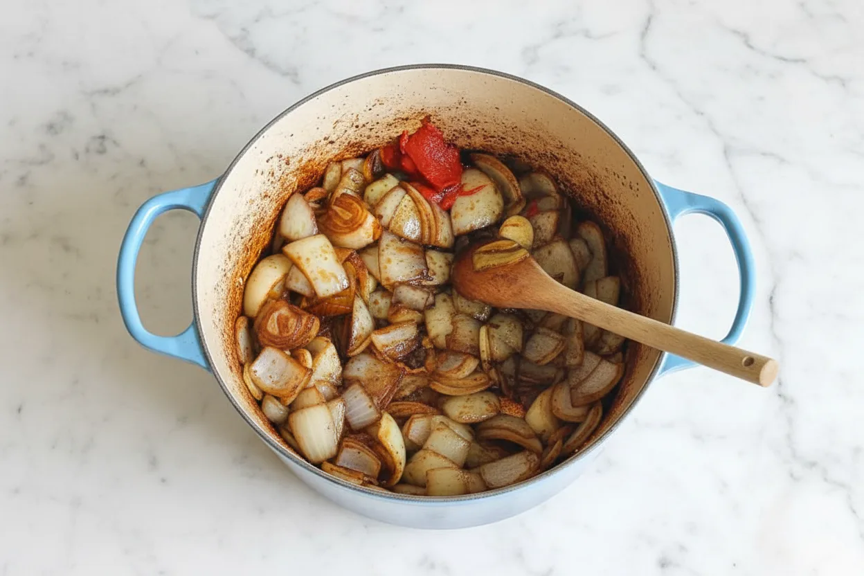 Dans la même cocotte, faites revenir les oignons et l’ail avec le vinaigre balsamique pendant 5 minutes en grattant les sucs de cuisson. Ajoutez le concentré de tomates et faites cuire 1 minute supplémentaire pour équilibrer son acidité.
