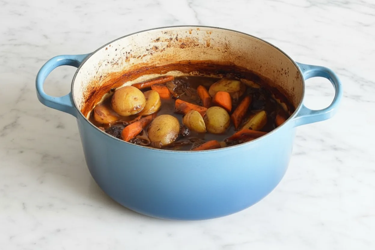 La cuisson lente transforme le bœuf en morceaux fondants tandis que les carottes et pommes de terre conservent juste assez de fermeté. Le bouillon épais obtenu grâce à la farine enrobe chaque bouchée d’une sauce veloutée.
