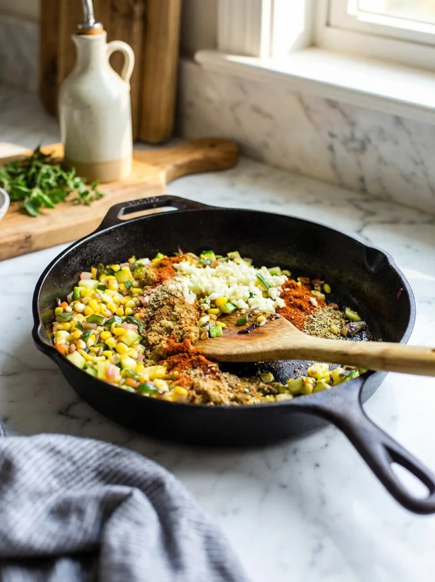 - Faire revenir oignon et poblano dans l’huile 7 min. Ajouter courgette et maïs. Cuire 2 min.