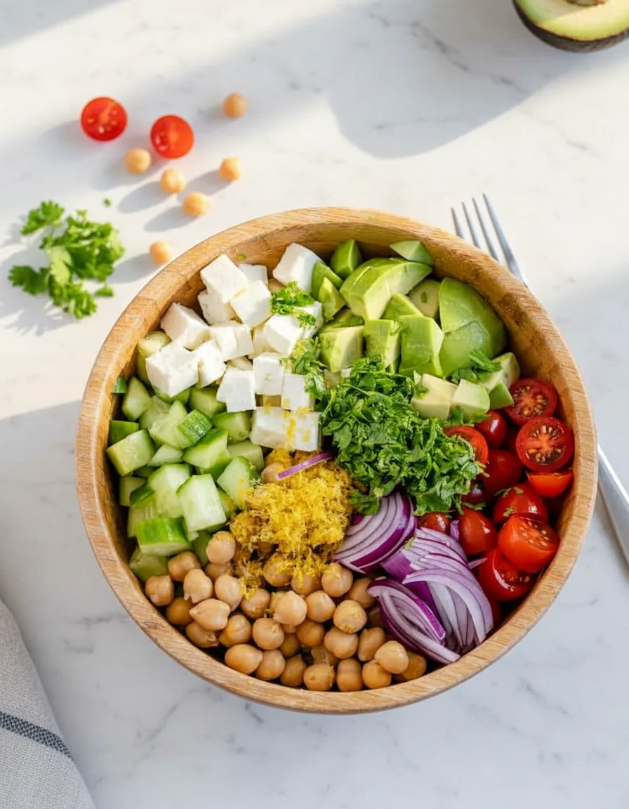 Une salade fraîche, crémeuse et rapide à préparer avec des pois chiches, de l’avocat et de la feta, parfaite pour un repas complet et sain.