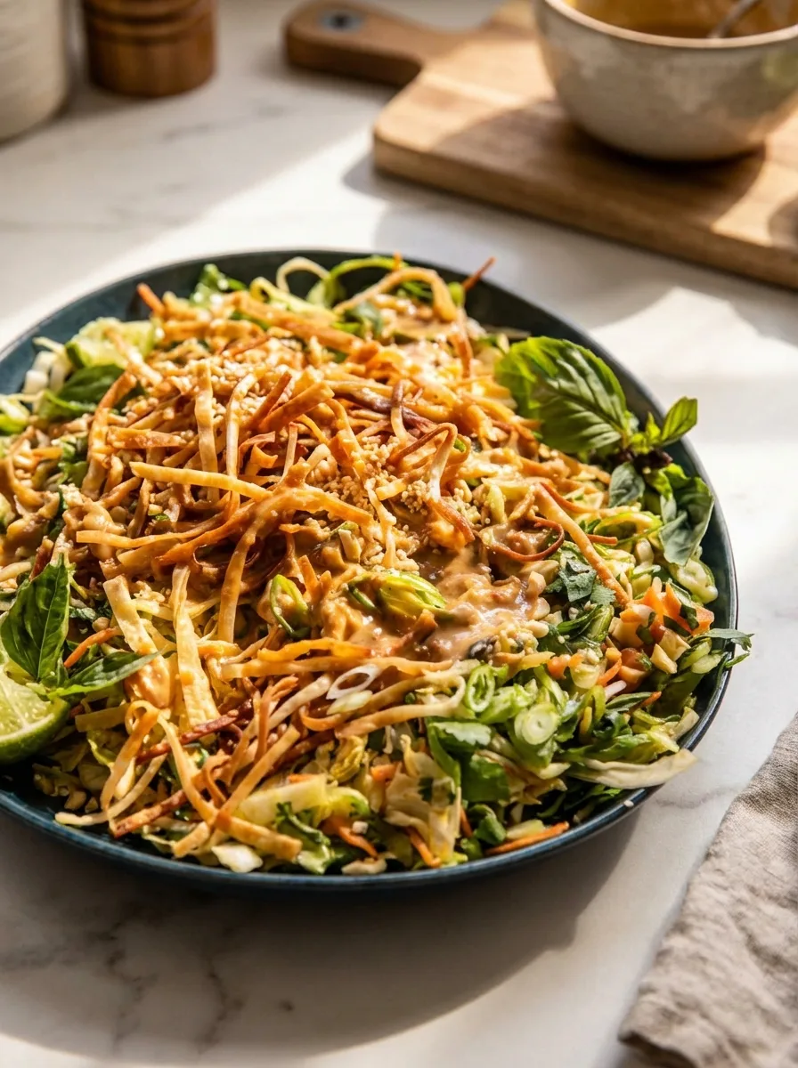 Découvrez cette recette fraîcheur qui allie croquant et saveurs asiatiques dans un plat équilibré. Avec sa sauce crémeuse aux cacahuètes et ses légumes colorés, cette salade devient idéale pour un repas léger ou un déjeuner au bureau.