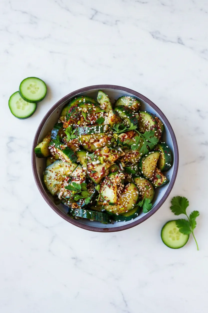 Une salade de concombre coréenne fraîche, croquante et légèrement épicée, parfaite comme accompagnement rafraîchissant.