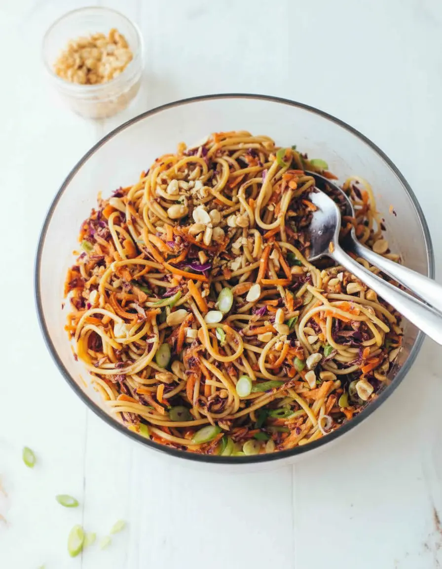 Cette salade de nouilles se conserve parfaitement au réfrigérateur, dans un contenant hermétique, pendant 2 à 3 jours. La sauce va continuer à parfumer les pâtes et les légumes, rendant le plat encore plus savoureux le lendemain. Pensez simplement à ajouter les cacahuètes grillées et les oignons verts au dernier moment pour préserver leur croquant et leur fraîcheur.