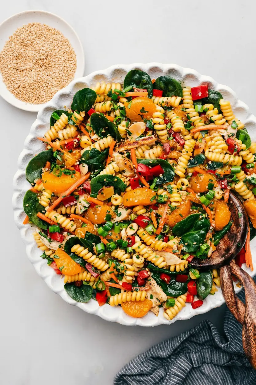Une salade de pâtes fraîche et équilibrée, alliant poulet, mandarines sucrées et une vinaigrette asiatique, prête en 30 minutes. Parfaite pour un dîner rapide ou un pique-nique.