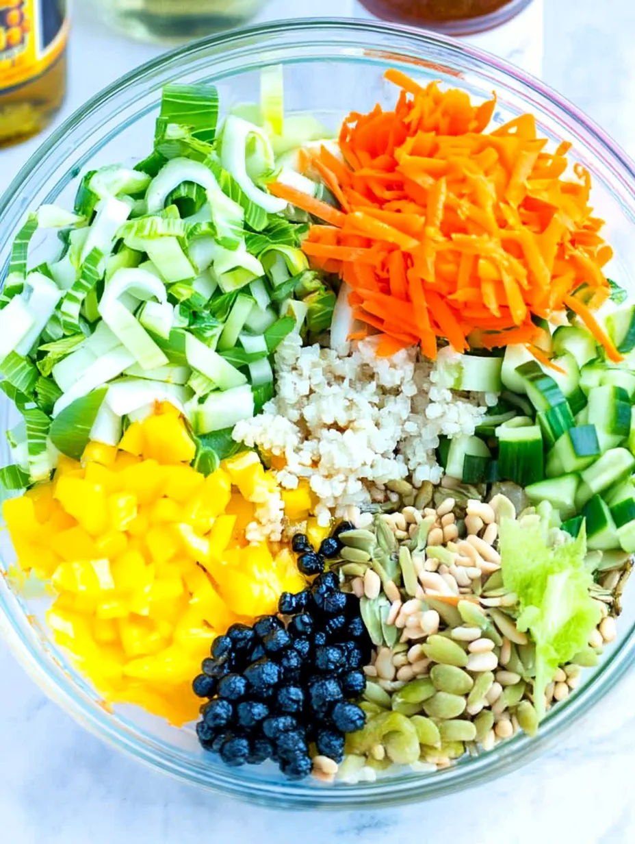 Dans un grand saladier, combine le quinoa refroidi, les pois chiches, le concombre, le poivron, le bok choy, les légumes râpés, les noix, les fruits secs et les herbes fraîches.