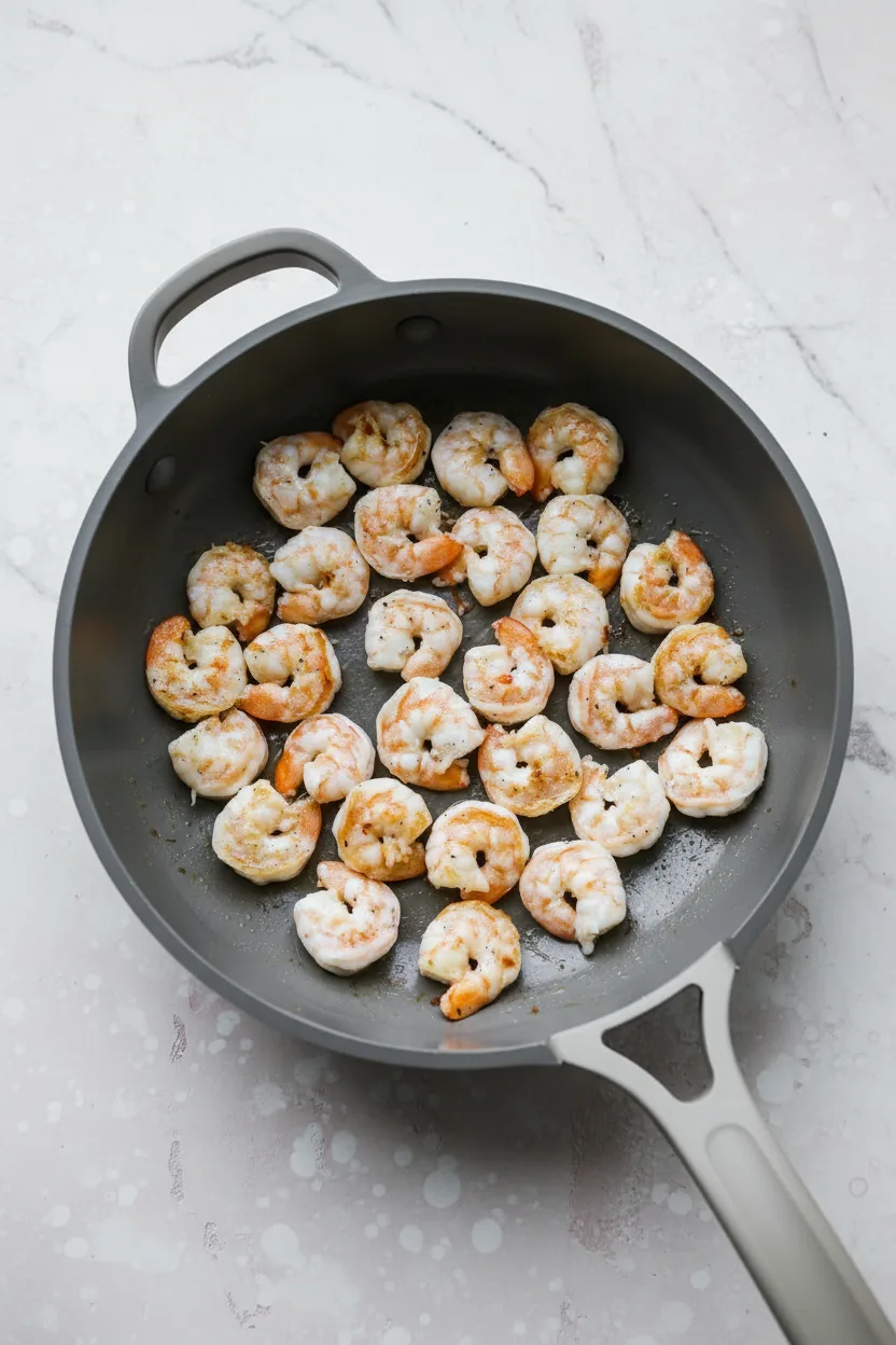 Ensuite, chauffez une grande poêle à feu moyen-vif. Lorsqu’elle est chaude, déposez les crevettes en une seule couche sans les serrer.