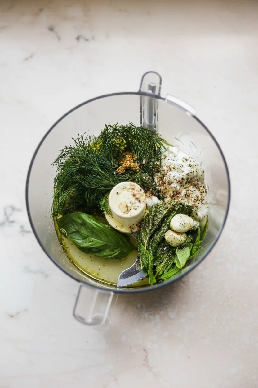 Pendant que les crevettes refroidissent, préparez la vinaigrette. Pour cela, versez tous les ingrédients de la sauce dans le bol d’un robot culinaire ou d’un blender. Ajoutez le yaourt grec, le jus de citron, l’huile d’olive, le vinaigre de cidre, la gousse d’ail pressée, le miel, le cumin, les herbes fraîches et une cuillère à soupe d’eau.