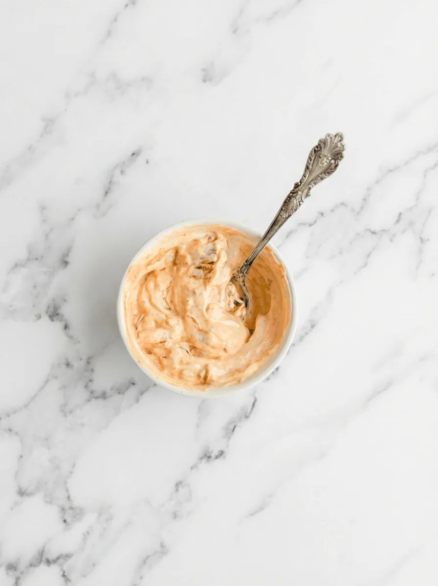 Osez une version au fromage blanc allégé à la place de la mayonnaise pour diminuer l’apport calorique. Pour relever le goût, incorporez une cuillère à café de miel ou de sirop d’érable.