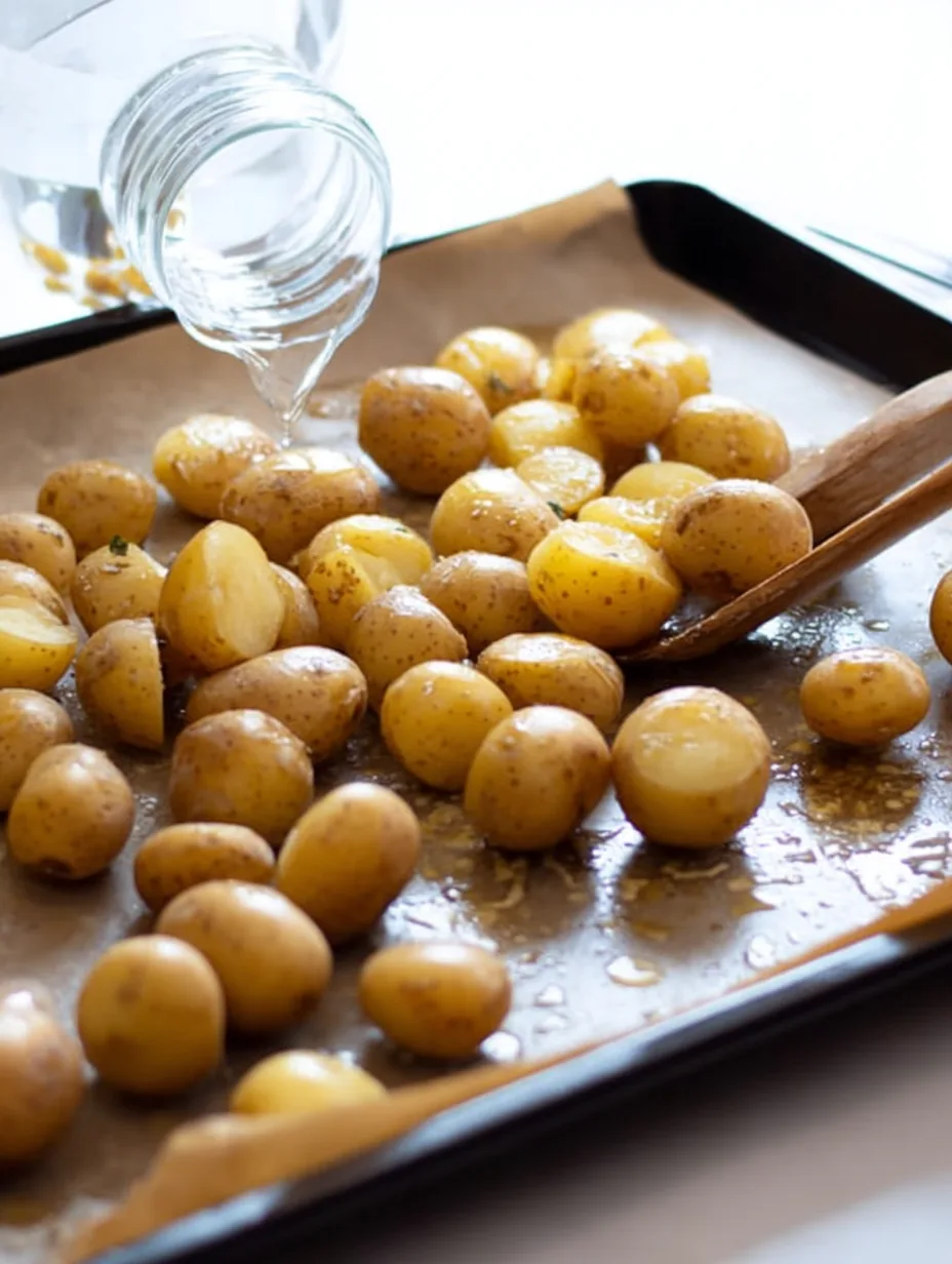 - Disposer les pommes de terre sur une plaque, arroser d’huile d’olive et de sel, puis verser un peu d’eau dans la plaque.