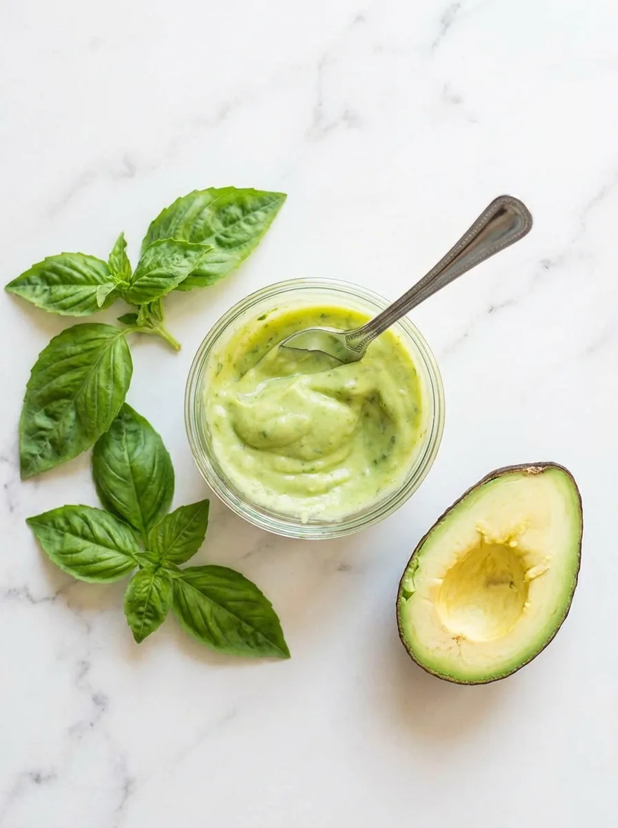 - Dans un blender, mixez l’avocat, le basilic, l’ail, le jus de citron, l’huile d’olive et la crème pour obtenir une sauce onctueuse. Salez si nécessaire.