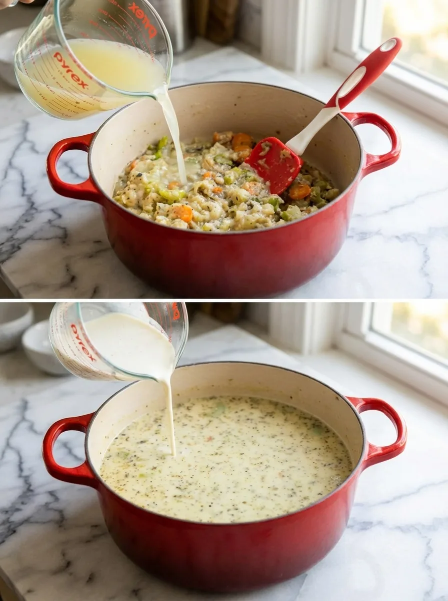 - Versez progressivement le bouillon de poulet en mélangeant pour éviter les grumeaux.