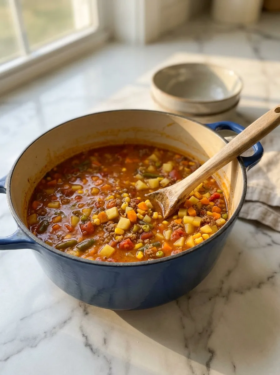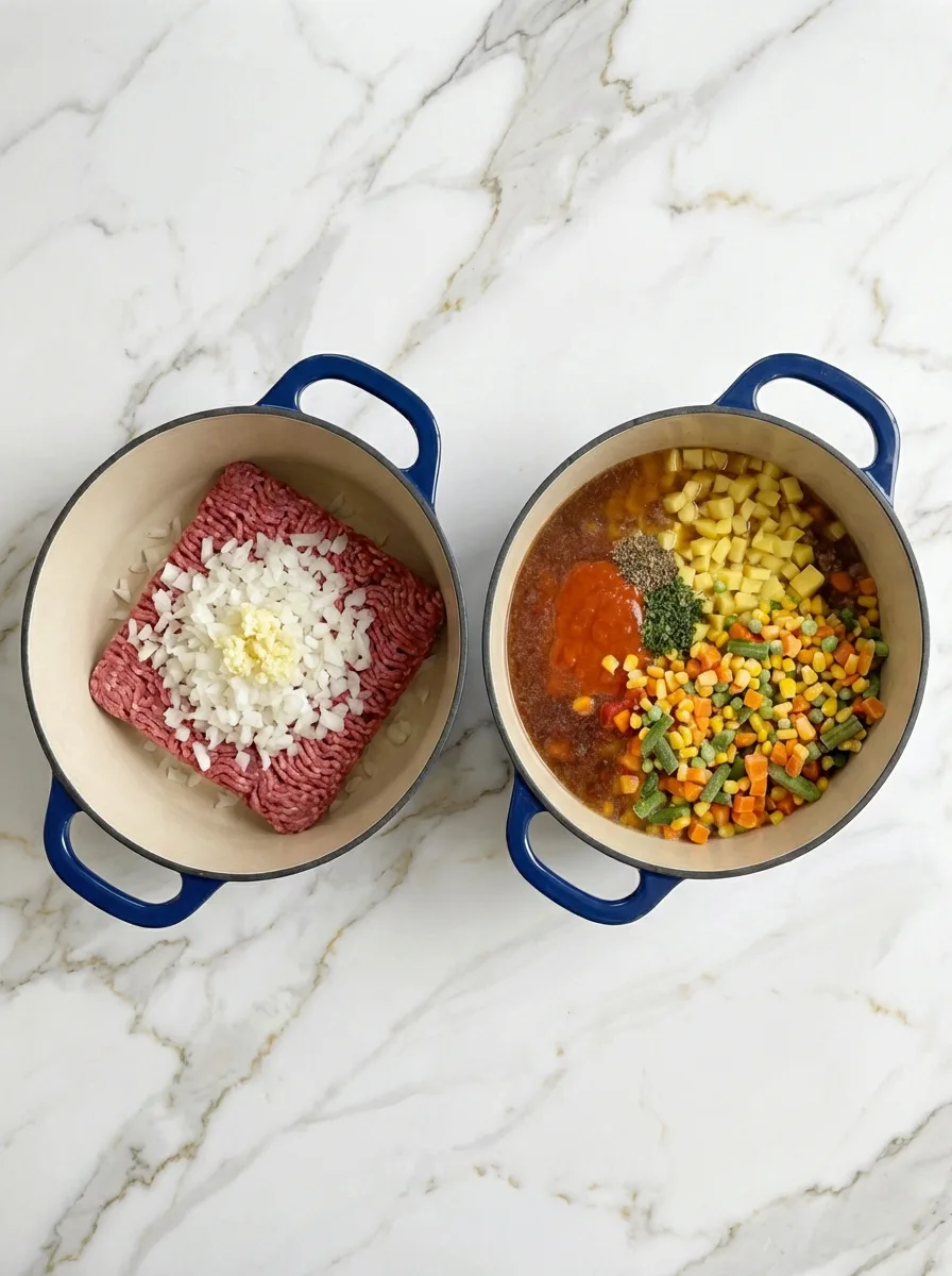 Une soupe réconfortante et complète avec du bœuf haché, des pommes de terre et un mélange de légumes, parfaite pour un dîner familial facile.