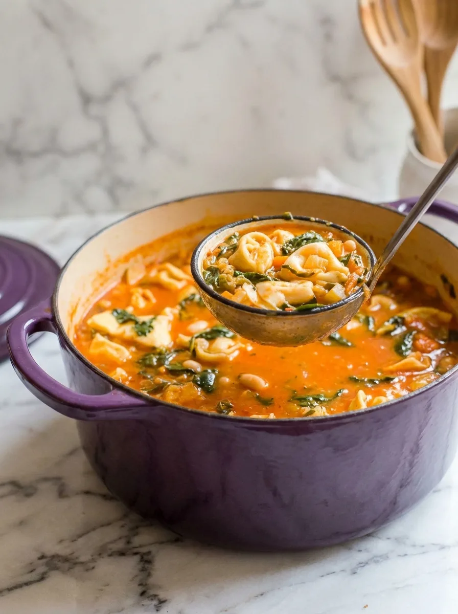 Maintenant, c’est le moment d’ajouter les tortellinis. Si vous servez la soupe immédiatement, ajoutez les tortellinis non cuits directement dans la cocotte. Laissez-les cuire pendant 1 minute de moins que le temps indiqué sur le paquet. Ils finiront de cuire dans le bouillon chaud. Sinon, faites cuire les tortellinis à part selon les instructions, égouttez-les et ajoutez-les juste avant de servir. Cette méthode empêche les pâtes de trop gonfler si vous prévoyez de conserver la soupe.